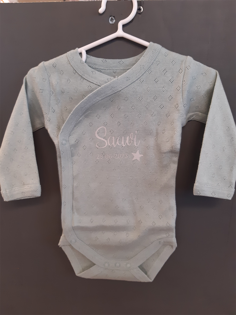 Ons rompertje is niet zomaar een rompertje; het is een gepersonaliseerd meesterwerk dat de naam en geboortedatum van de kleine bundel van vreugde met trots toont. Gemaakt van zachte, hoogwaardige materialen, is het rompertje zowel comfortabel als schattig – perfect voor die kostbare eerste momenten.